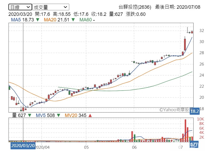 台驊投控 - å°é©ææ§ 伿¥ç¤¾æè²¬ä»» Sustaihubæ°¸è¨æºåº«. Jul 02, 2021 · 台驊投控(2636)今(2)日股價衝破300元,收盤價307元,創歷史新高,更超越陽明(2069)與長榮(2603)。法人分析,該集團股價能衝得這麼高,除了股本小,海運占比高,投資陽明、長榮也是主因,而持有台驊1萬多張股票的半導體通路龍頭大聯大(3702),投資的台驊股票僅約一年帳面價值十倍增,已達33.54億元。 Jun 02, 2021 · 台驊投控(2636)4月獲利繳出亮麗成績,激勵貨運承攬族群強漲,台驊拉出第6根漲停,中菲行(5609)、捷迅(2643)盤中都出現漲停價位,中菲行逼近百元. Jun 30, 2021 · 航運股后台驊投控(2636)董事會決議,以不超過10億元的金額,參與認購陽明(2609)今年度的現金增資。台驊目前持有近2萬張陽明股票一張未賣,未實現利益已經超過25億元,也是讓台驊這波股價持續創高的主要動力。 Jun 30, 2021 · 大聯大去年5月考量雙方業務合作互補性,並看中台驊投控獲利穩定,且殖利率不錯, 宣布以28元公開收購台驊投控,同年7月又加碼價格提高至32元,去年財報顯示,共計收 購10,112張,帳面金額3.23億元。 May 31, 2021 · 海空鐵路貨運需求旺盛,台驊投控(2636)今年營運看漲,股價連飆4根漲停,今天並突破百元,股價續創歷史新高,也是近期第四家過百元的航運股。台.